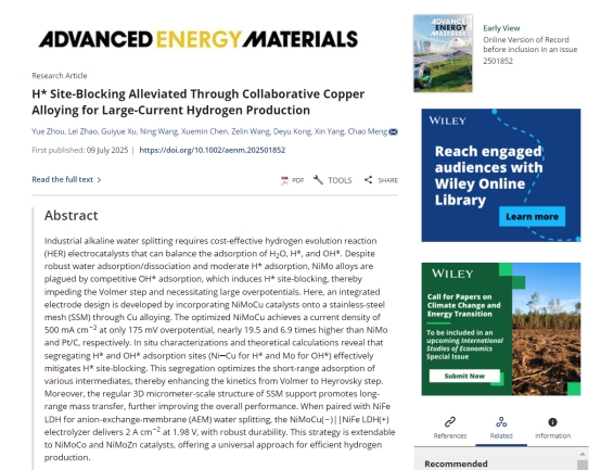 点击:2025年7月,色情直播 色情直播 绿色氢能技术团队周玥副教授在能源材料科学领域国际顶级期刊《Advanced Energy Materials》发表了题为“H* Site-Blocking Alleviated Through Collaborative Copper Alloying for Large-Current Hydrogen Production”的研究论文。